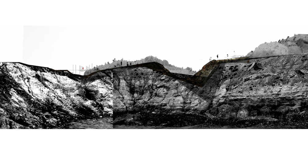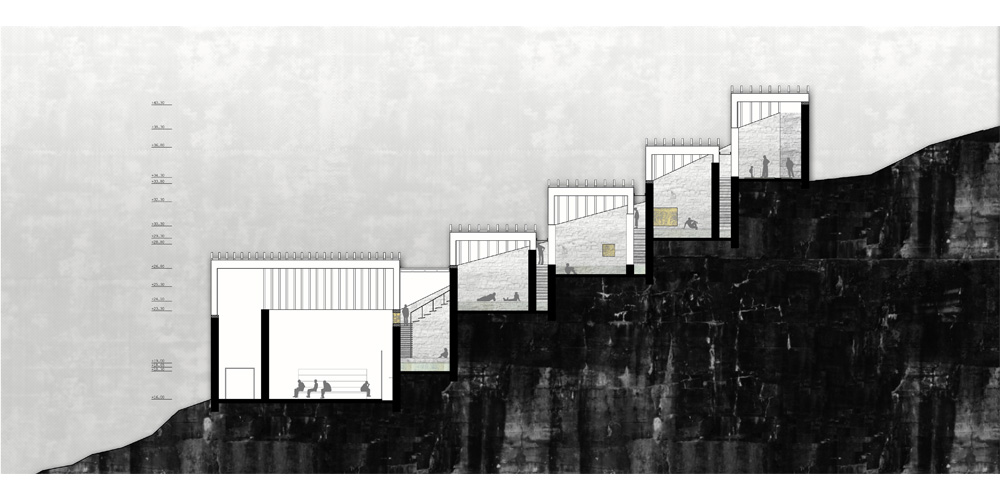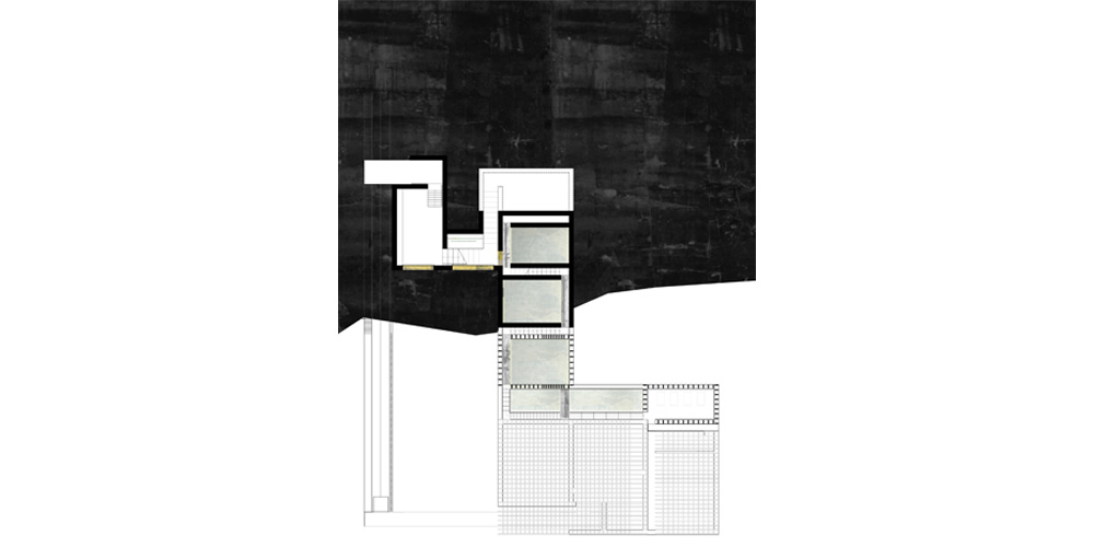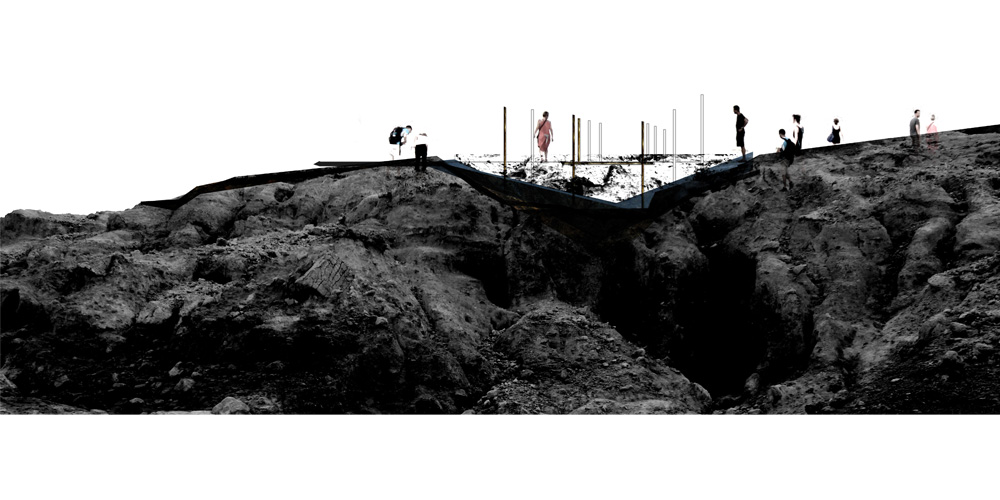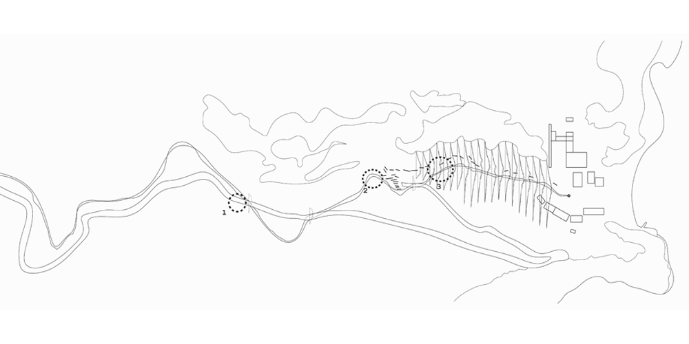 While the visitors reach the harbor, they receive the following directive: let them be guided by the traces that the water leaves on the dry soil of the island. The route begins by means of car and leads to the discovery of the final destination. The water moves erratically and simultaneously with the road, indeterminately penetrating the wild soil of Milos, coloring the already multicolored landscape. There are moments where the water meets the movement of the visitor without however actually touching. It is a relationship evolving through time and distance and deliberately delays the encounter between person and the natural element of water. It is a feeling of waiting for the unknown. Approaching to the final objective these entanglements become more intense in frequency and size. Thus the visitors are spontaneously informed for their expected arrival. The landscape is revealed progressively through the rocks and the white cloths that wave with the soft passage of the wind. The route reaches the end and now the visitors experience the environment with all their senses passing from the remainder stages until they reach their final destination. Walking under the shade of cloths, on thin, wooden surfaces sculpted on the ground, they become aware of the existence of the old factory that stands still, placed onto the rocks and its presence is supplemented of the discretion of the use that accommodates today. The sound of the water in the baths, the sound of the water of the sea prevail and the visitors enter cowardly, guided again from the traces of water, towards the interior of the baths. The hot, controlled light that enters from the roof creates an atmosphere of relaxation and confidence. The semi-nude now visitors are going down de the long semi-transparent corridor that leads to the lift and transports them to the beginning of their treatment. The human body through this process “shows itself”, it is forced to be viewed, although through the material and the light, a balance is achieved between “give to viewing” and “showing” the human body. The body is offered as a spectacle without however being imposed and nearly not being able to distinguish it. It is given to the landscape and is absorbed by it. Through the material and the light they tend to become one. The naked now visitors after they abandon their last piece of clothing that covered their body, enter in a narrow, dark, humid, ascendant corridor that leads them to the first room of preparation. There they try to get familiar with the water of low temperature through cloths that impregnates each one in the long reservoirs of cold water. Low voices and few discussions are heard from the lower rooms with which the visitor gets in touch while going down from the first room of preparation to the next. The touch, the sense of hearing but also the smell participate in the perception of space. The smell of sulphur submerges the rooms of baths while the visitors remain in the water. Next stage: the contact of the body with the hot water enriched with sulphur. The treatment is continued with more tepid water this time and from there the body is prepared to enter in cold water in order to get accustomed to water with a temperature that it feels familiar with, and does not “suffer” anymore so as to complete the purification experience.